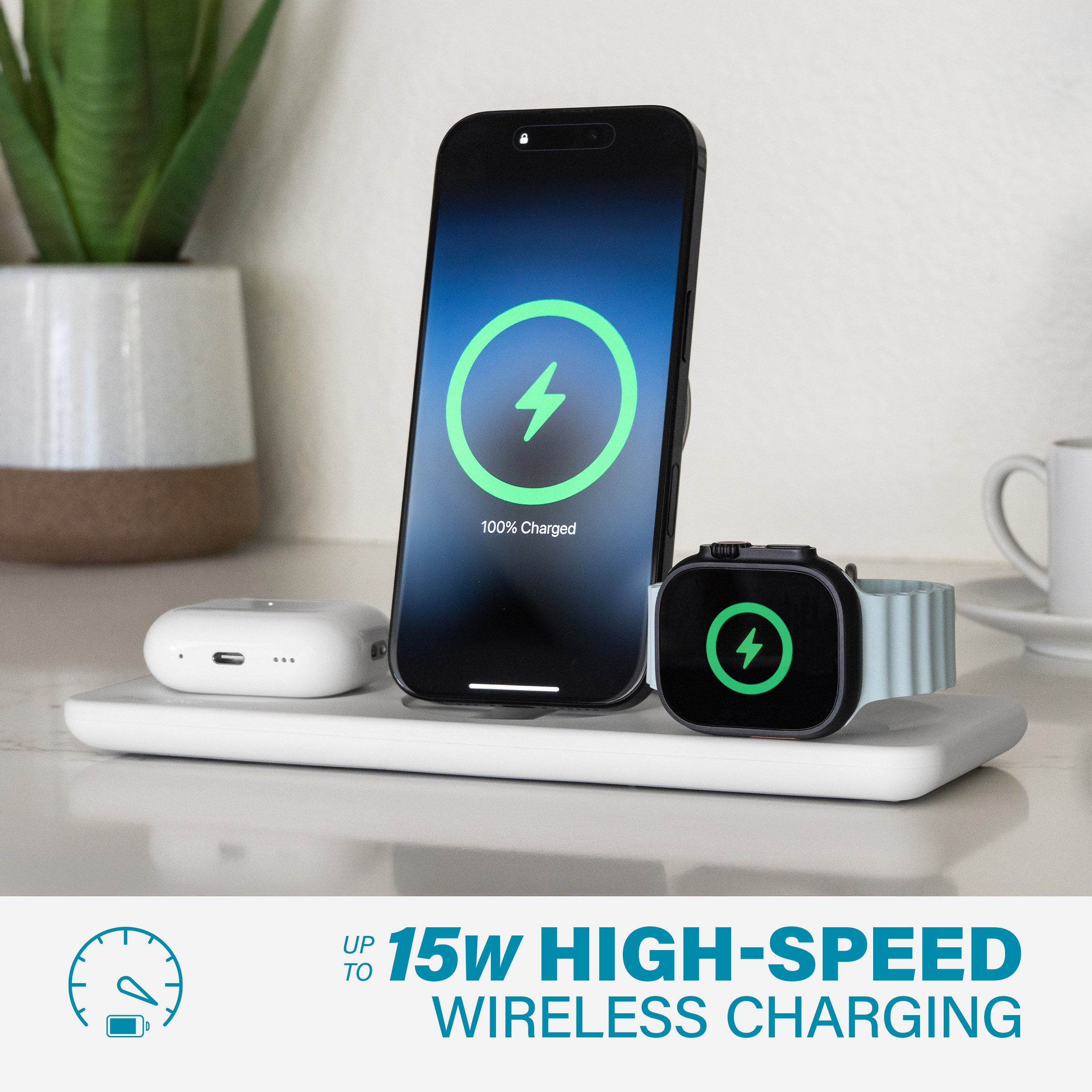 Dedicated charging zones to power your iPhone, Apple Watch, and AirPods simultaneously in one convenient space. Eliminates the need for multiple chargers and extra cables, keeping your setup clutter-free, simple and organized.