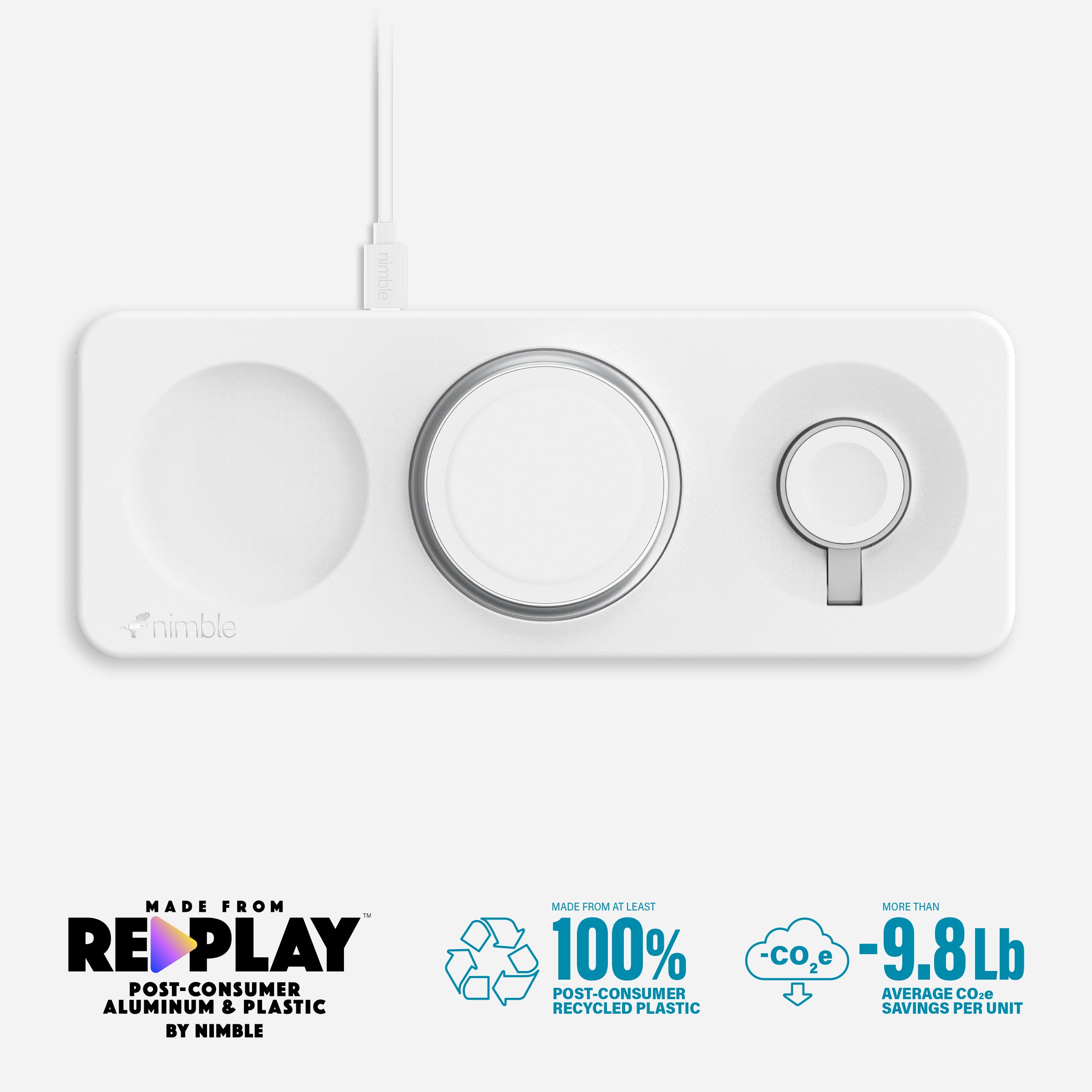 Made with 100% REPLAY post-consumer plastic and aluminum, and packaged in plastic-free recycled paper for an average savings of -9.8 lbs of CO2 compared to other chargers. Also includes free e-waste recycling for your old tech!