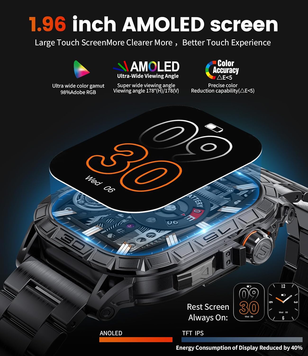 - 【HD AMOLED Touchscreen & Customized Watch Faces】This rugged smart watch for men features a large HD AMOLED touchscreen with a resolution of 410*502, delivering high contrast, vibrant colors, energy efficiency, and exceptional touch sensitivity. The sport watch supports 300+ watch faces(4 built-in watch faces and 300+ available on the app), allowing you to choose different ones according to your preferences. If you're not satisfied, you can design and upload your own images to enhance the aesthetic appeal and quality of the smartwatch, boosting your confidence.