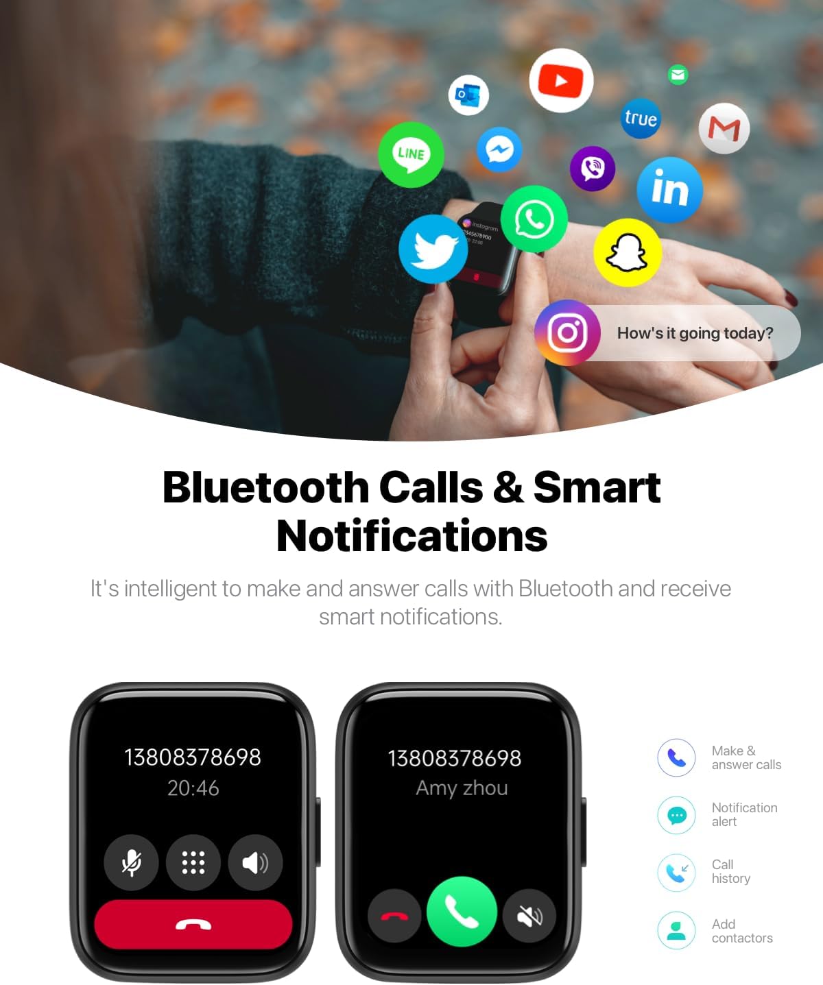 - SMART NOTIFICATION & QUICK REPLY — Receive gentle vibrations on your wrist for incoming messages, calls, and alerts. The smart watch for Android phones lets you send preset quick replies to calls and messages(quick reply is available for Android users only), which you can stay connected without even having to take your phone out of your pocket.