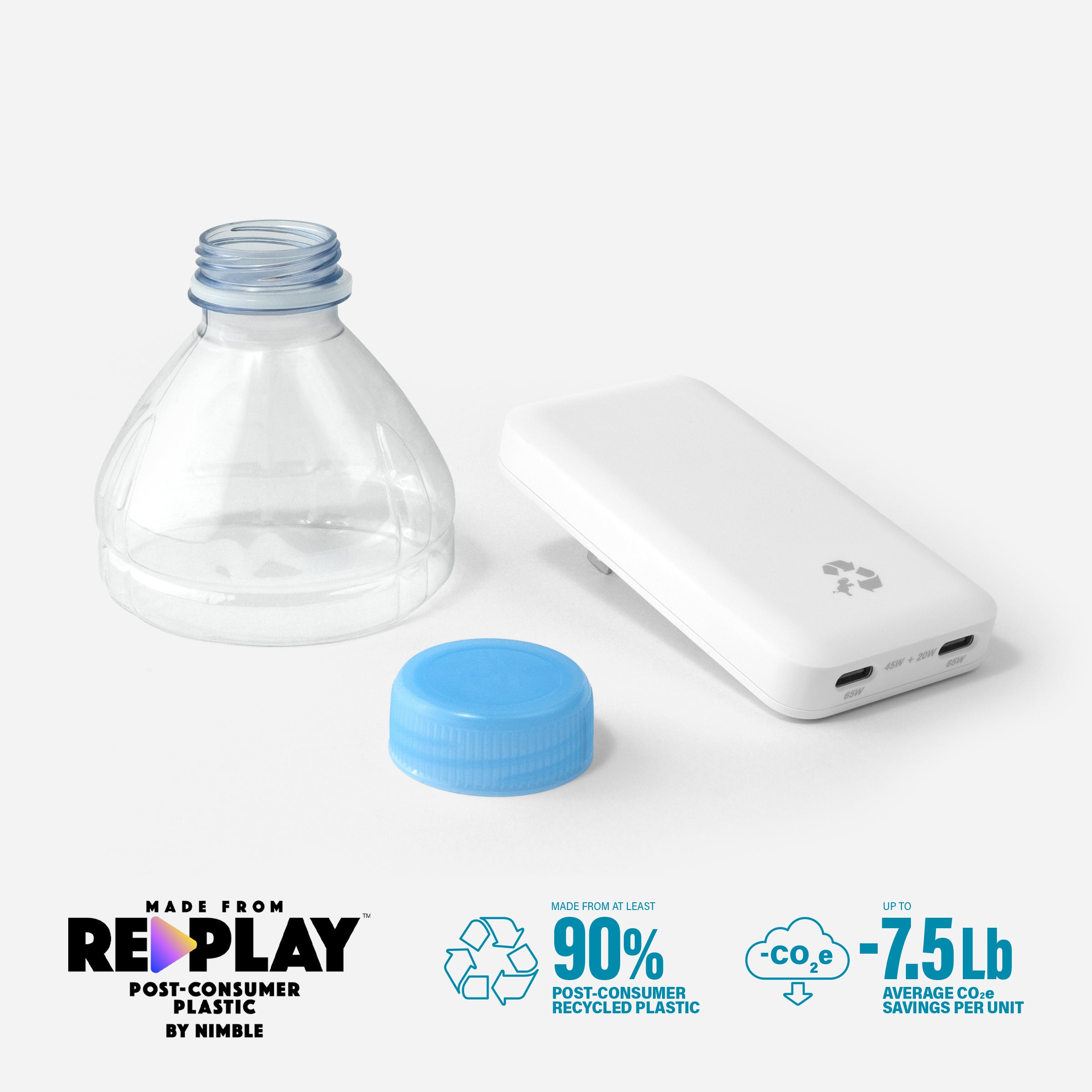 Housed in 90% post-consumer plastic, and packaged in post-consumer scrap paper for an average saving of -7.5 lbs of CO2 compared to other wall chargers. Plus, includes free e-waste recycling for your old tech!